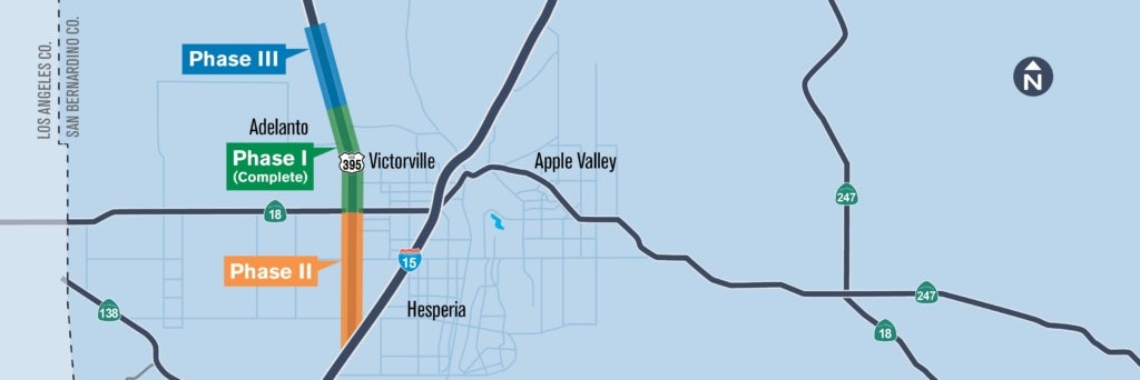 US Route 395 is one of the primary north–south highways in Southern California, providing critical connections between economic centers, residential communities, freight corridors, and both urban and rural areas. Phase 2 of the US 395 Freight Mobility and Safety Project will improve the nearly seven-mile segment between Interstate 15 (I-15) and State Route 18 (SR-18/Palmdale Road) by expanding the roadway from two lanes to four lanes and adding a raised median, turning lanes, and eight-foot shoulders to enhance safety, mobility, and freight operations along the corridor.